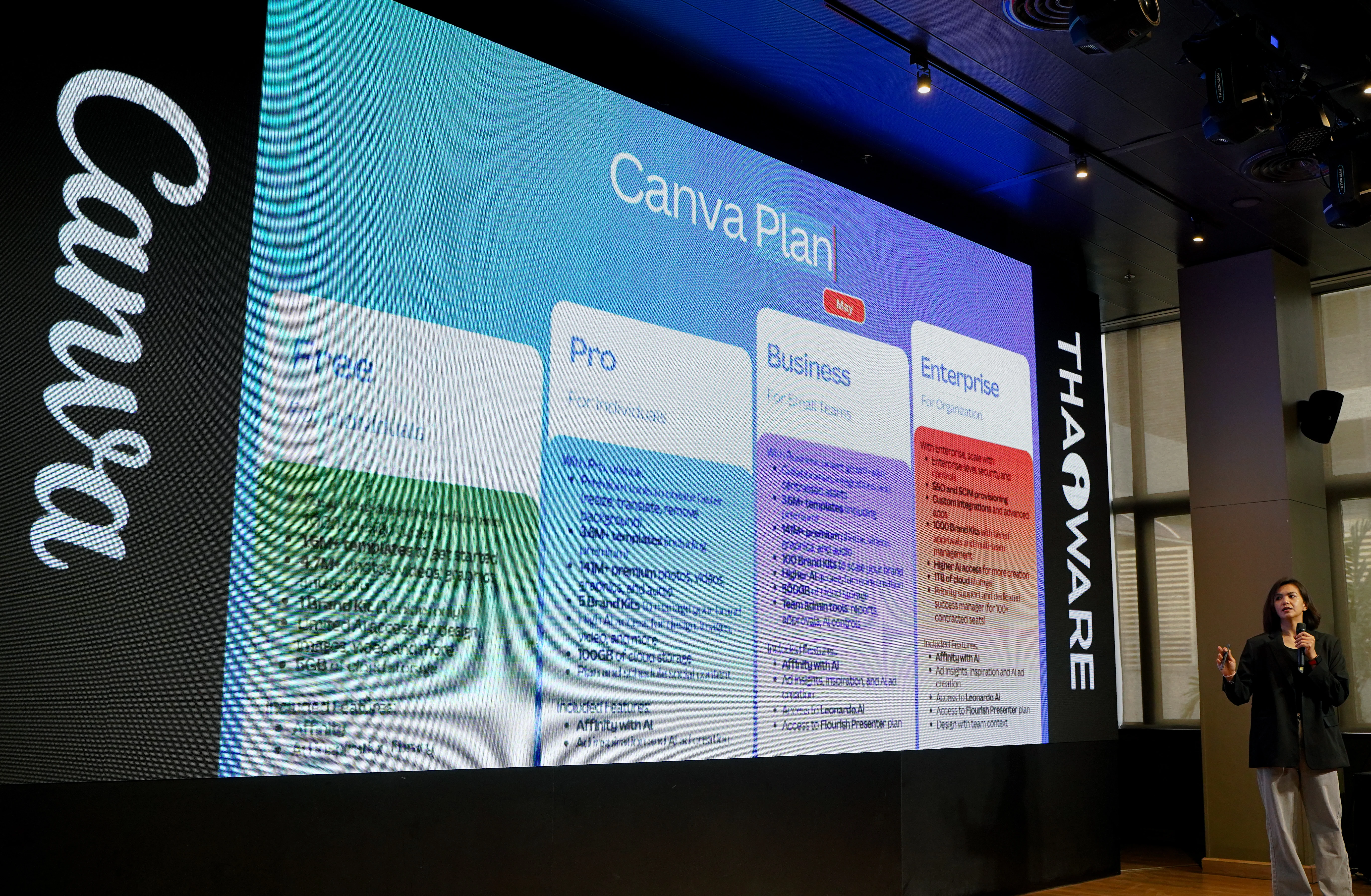 ลำดับต่อมา สุดาพร รอดประเสริฐ ผู้ช่วยผู้จัดการฝ่ายขาย บริษัท ไทยแวร์ คอมมิวนิเคชั่น จำกัด ได้นำเสนอรายละเอียดฟีเจอร์ที่แตกต่างกันของแผนการใช้งาน Canva Business และ Canva Enterprise ซึ่งเป็นรุ่นที่สูงกว่า โดยมีฟีเจอร์ที่เพิ่มเข้ามาคือการจัดการผู้ใช้งานในระดับสูง พื้นที่จัดเก็บที่ใหญ่กว่า การปรับแต่งให้ตรงตามความต้องการของธุรกิจผ่าน API และมาตรฐานการรักษาความปลอดภัยข้อมูลระดับสูง